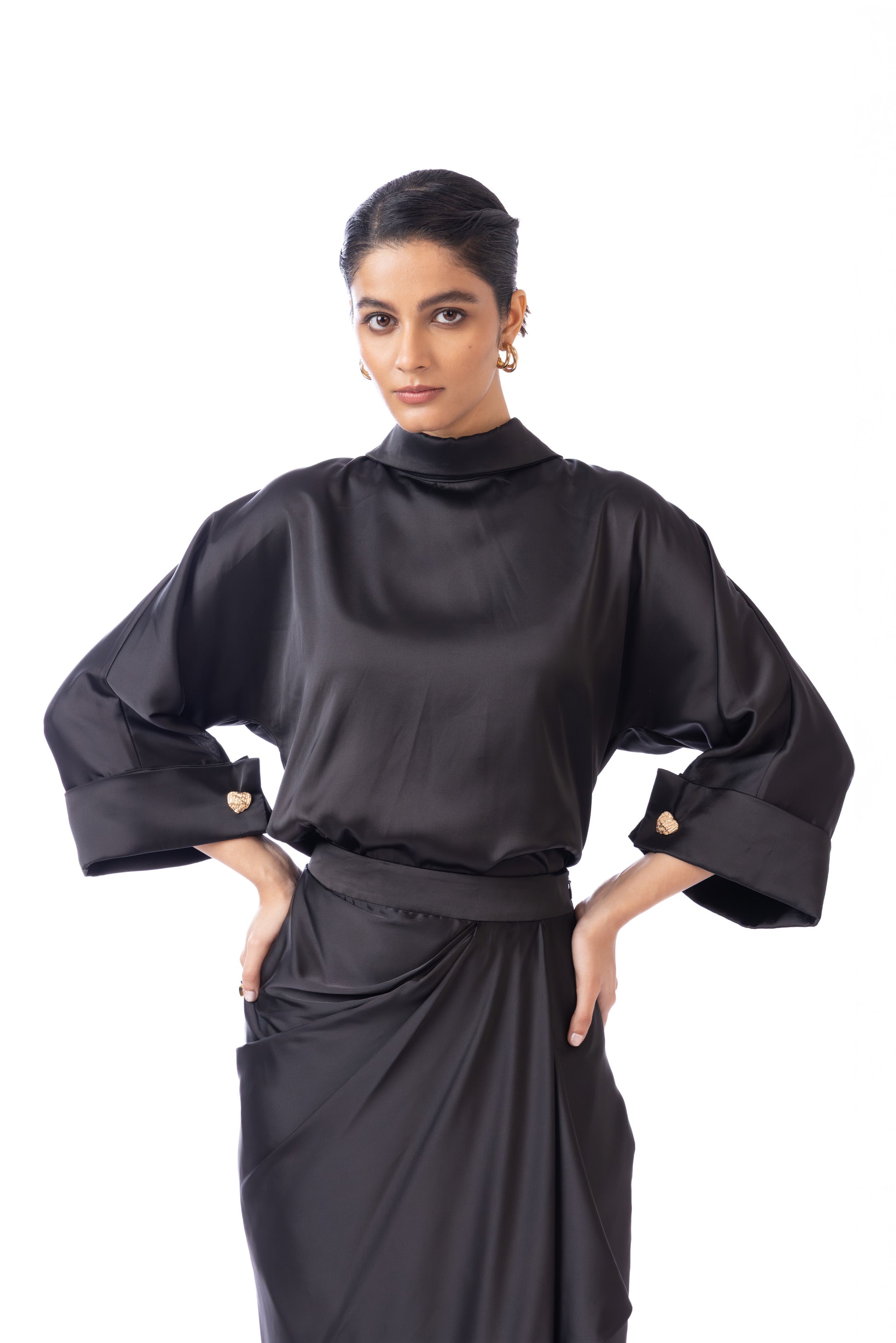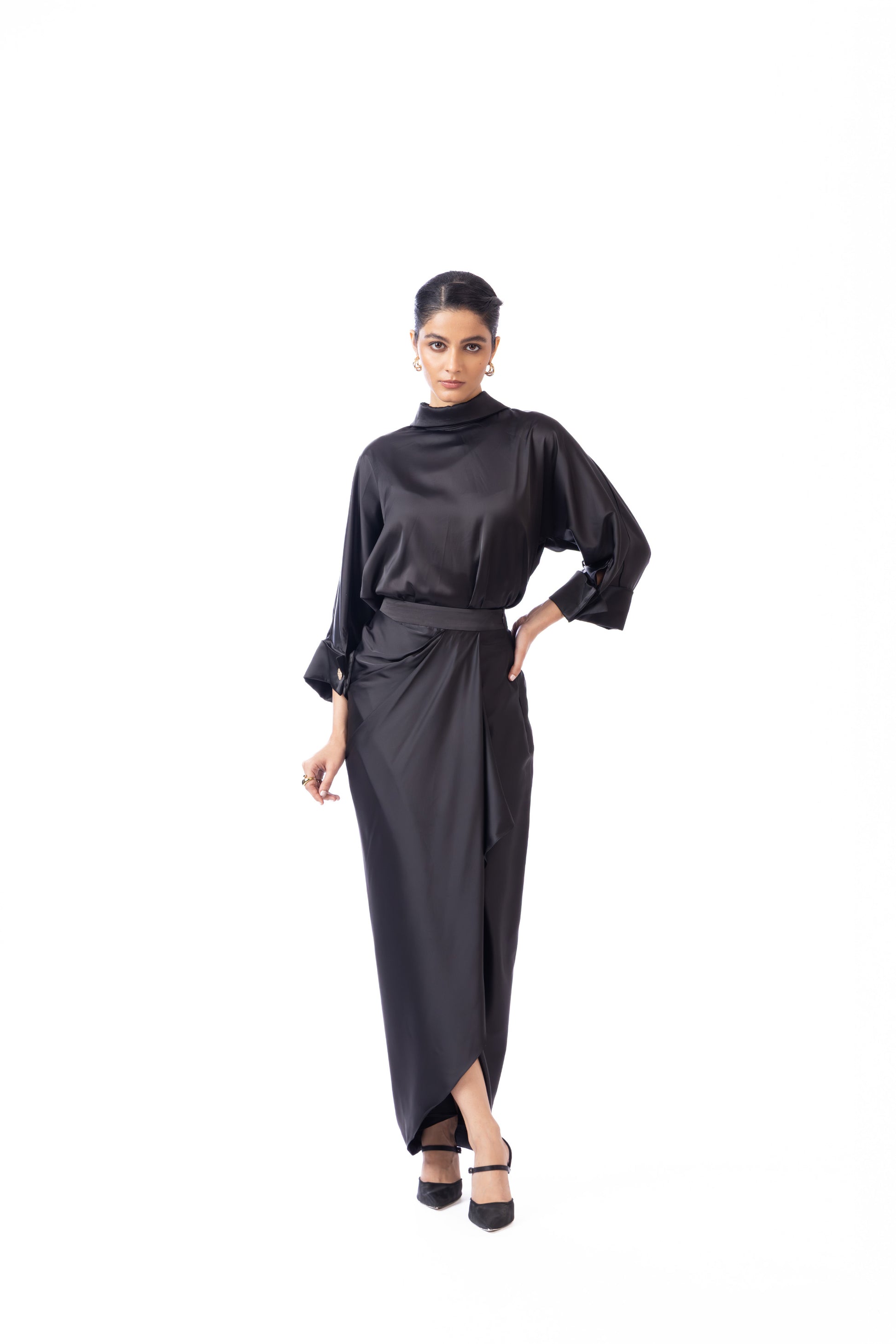 Crafted in a lustrous satin, our Picked-Up Skirt features cascading drapes with a below the knee slit. Pair this piece with our Kaftan Top with scalloped cuffs for a chic and easy-to-carry ensemble.